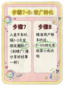 人差不多的时候,第二,三天发朋友圈,发一个软文广告,看看带货效果如何,注意细节,不要硬广,有一种有好事,想告诉你的感觉。 -